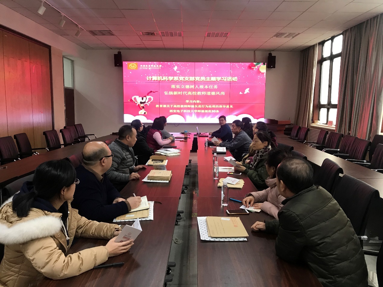 (通讯员 王晓丽,同榛)2018年12月25日下午,太阳集团www0638计算机科学系党支部在北校区主楼二区319会议室召开以“落实立德树人根本任务、弘扬新时代高校教师道德风尚”为主题的学习活动,深入学习了《新时代高校教师职业行为十项准则》、《教育部关于高校教师师德失范行为处理的指导意见》和《西安电子科技大学师德规范30条》。计算机科学系全体党员参加,会议由计算机科学系党委书记戚玉涛同志主持。