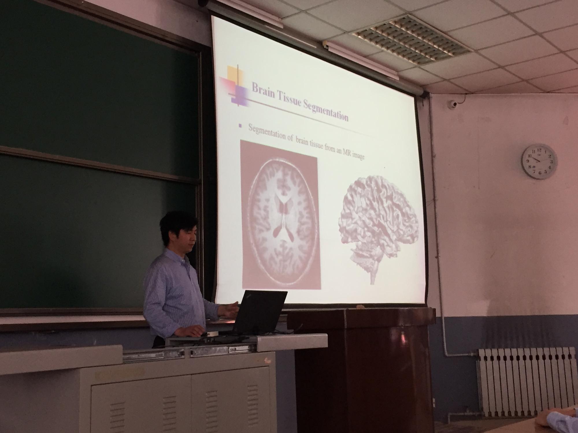 中,李纯明首先介绍了距离正则化水平集方法及其在图像分割中的应用,之后李教授分析了能够分割具有灰度不均匀性图像的水平集方法,此后又描述了能够同时分割和校正灰度不均匀性的能量极小化模型,最后介绍了基于多图谱和解剖学几何性质的大脑和心脏分割模型。李教授生动描述了水平集方法中数学公式下隐藏的物理含义,并通过视频演示解释了水平集方法的演化迭代过程。